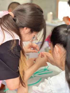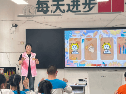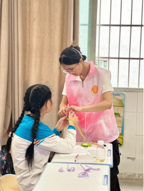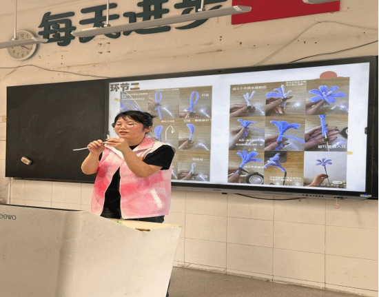 活动开始闫老师和张老师带领童心向阳服务队10名教育学院学生来到了特殊教育学校培智七年级。志愿者覃襄同学作为本次志愿活动的小老师,首先是询问同学们知道哪些花,调动同学们的积极性,再为同学们展示“祖国的花朵”手势舞,激发同学们对本次志愿活动的兴趣,接着带领他们学习手势舞,让他们体验手势舞的乐趣。下一个环节是由覃同学教同学们学习如何用扭扭棒做一朵花花,最后由我们志愿者对本班同学一对一指导进行手工制作,锻炼孩子们的审美能力以及动手操作能力。