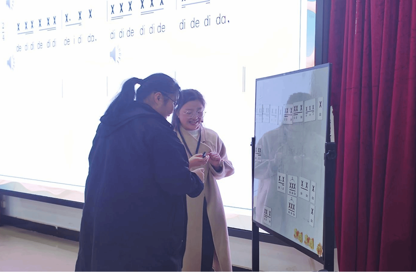 随后,张秀丽老师呈现了一堂《麒麟的节奏密码》的公开课,将音符与休止符教学融入生动情境,通过互动游戏激发学生兴趣,展现音乐课堂的趣味性与创新性。张何佳老师则以《Do Re Mi之歌》为例,借助沙锤、双响筒等教具开展节奏教学,课堂氛围轻松活泼,学生在体验中深化对音乐要素的理解。