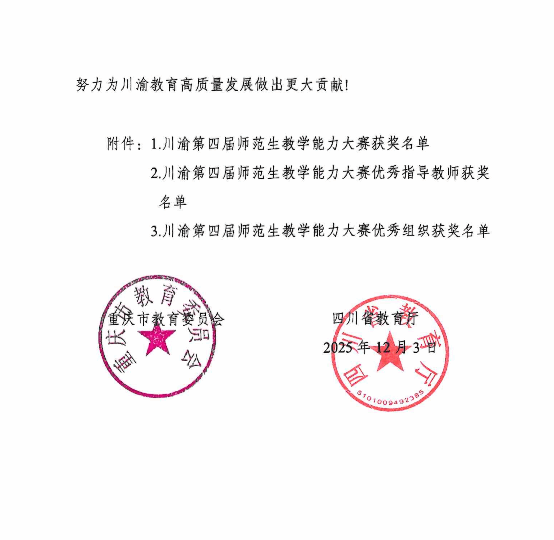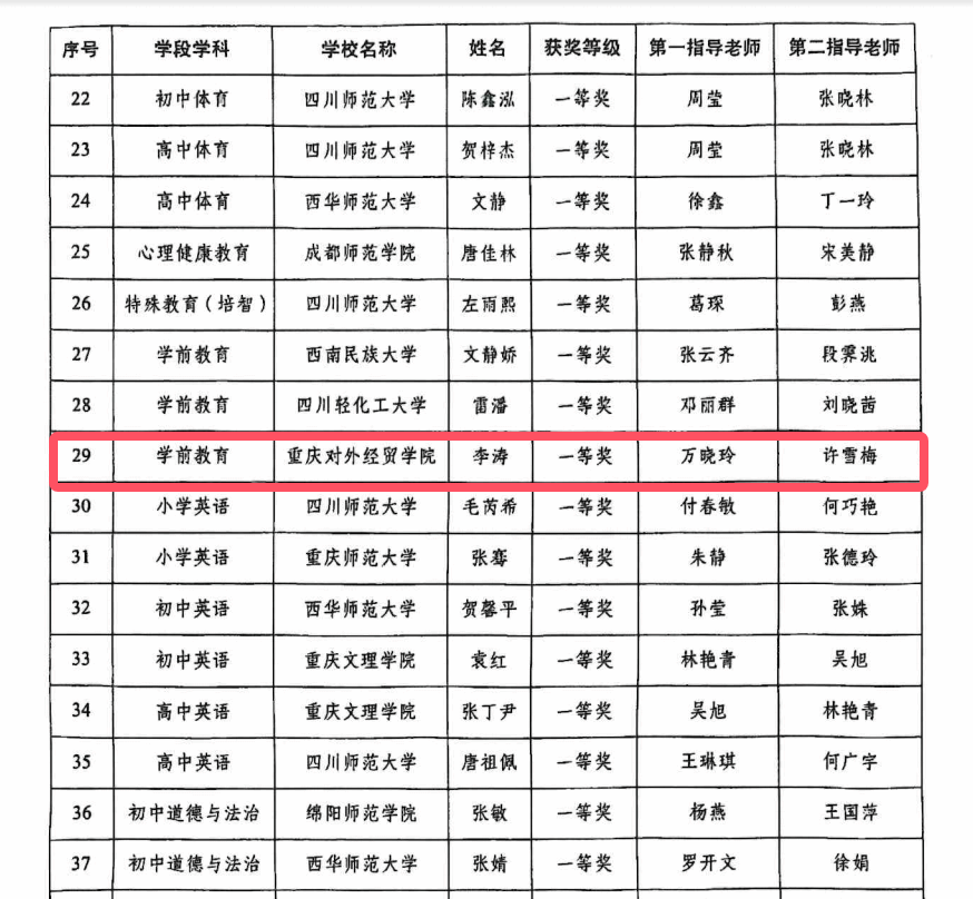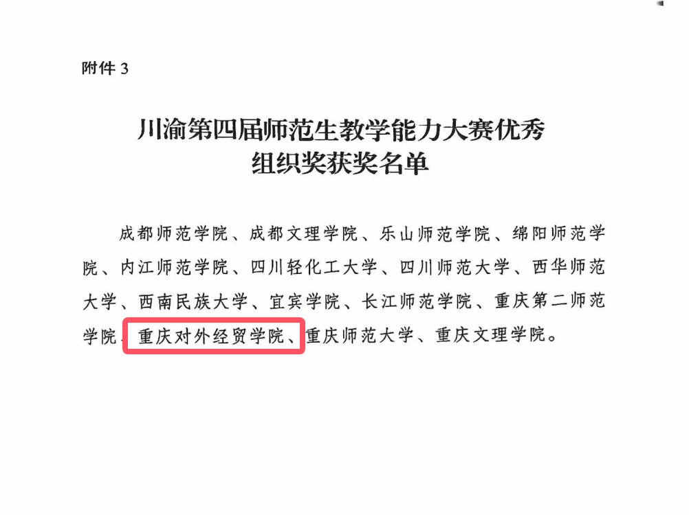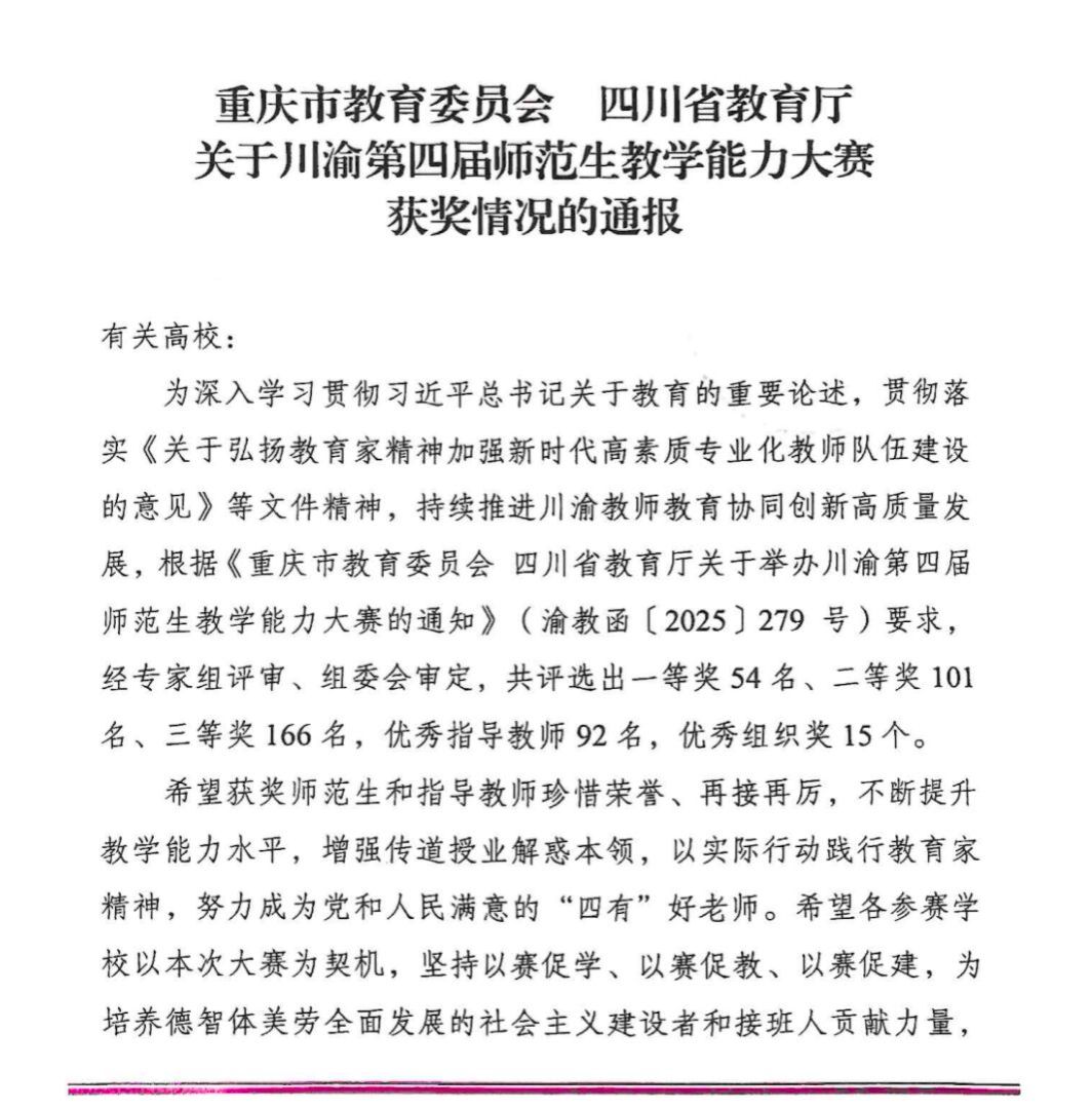 近日,川渝第四届师范生教学能力大赛在长江师范学院圆满落幕,我院2022级学前教育本科5班的李涛同学在我院教学副院长许雪梅副教授的鼎力支持、万晓玲老师的精心指导下,凭借扎实功底与出色发挥,从众多参赛队伍中脱颖而出,一路过关斩将斩获“一等奖”,许雪梅老师、万晓玲老师凭借专业引领荣获“优秀指导教师”称号,重庆对外经贸学院荣获优秀组织奖。