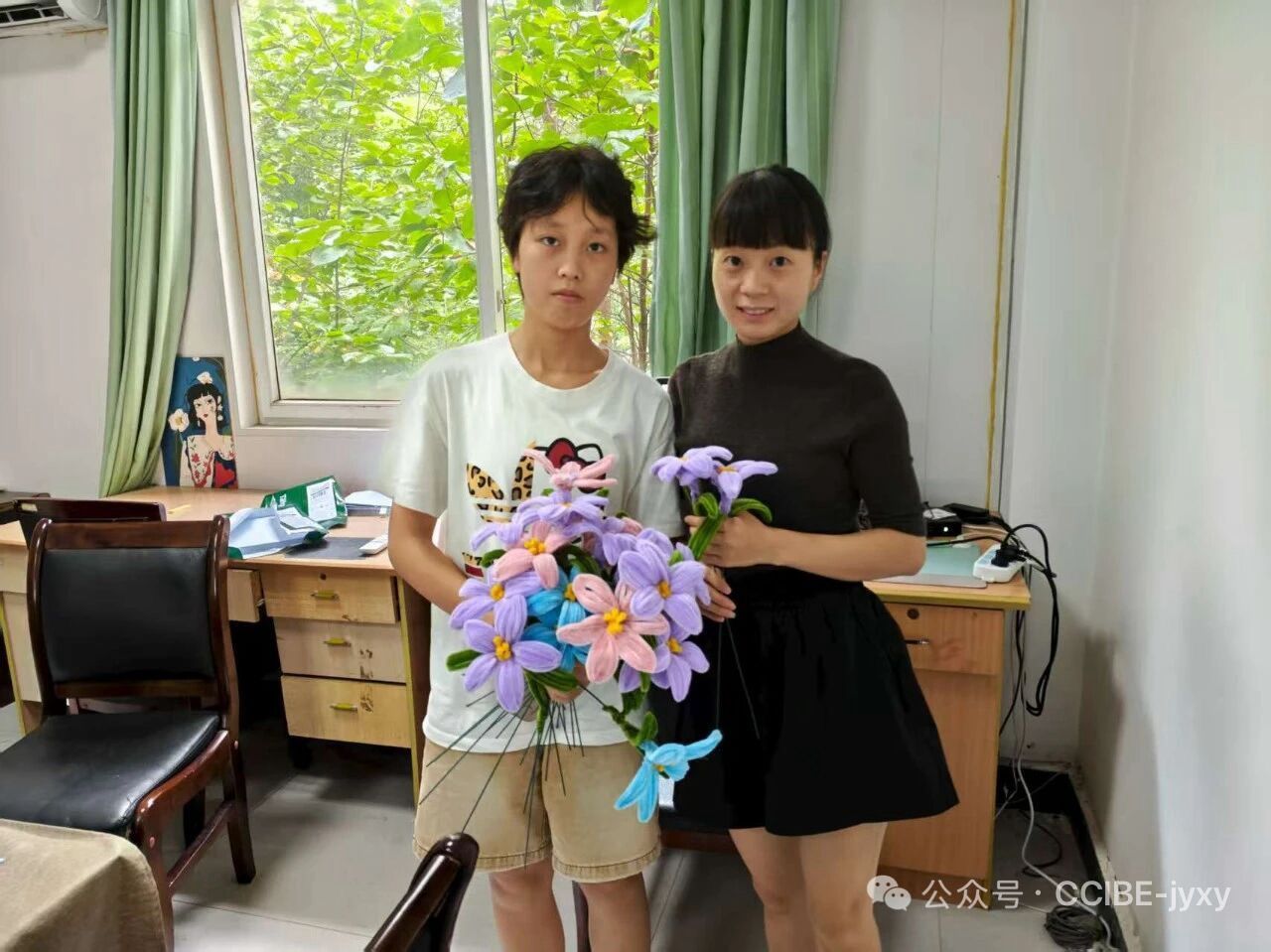 在教师节前夕,团学组织骨干刘丹、陆军菊、易景阳等同学积极牵头,与学生志愿者孙俪、余晨皓、卢远扬、吴鸿伶、白碧瑞、李涛等一同利用课余时间,集体投入到扭扭棒手工花的制作中。同学们巧妙运用色彩缤纷的扭扭棒,通过捻、转、缠、绕等手法,将一根根普通的绒条转化为一朵朵绚丽独特、充满生命力的手工花束。每一朵扭扭棒鲜花都倾注了同学们对老师的感激之情,体现了学子们匠心独运的创意和真挚温暖的心意。