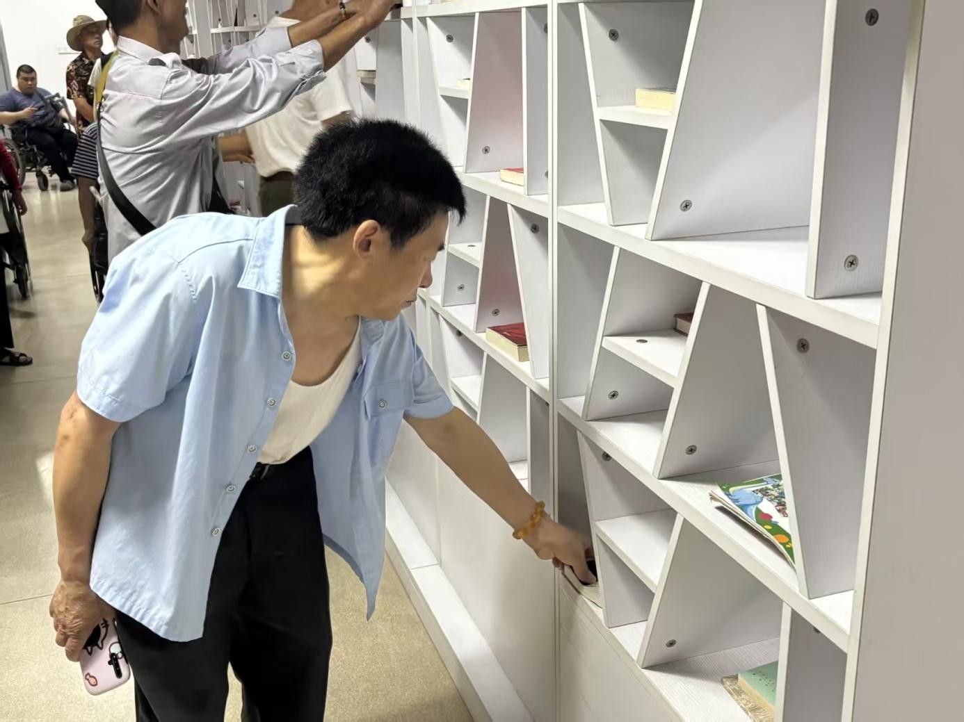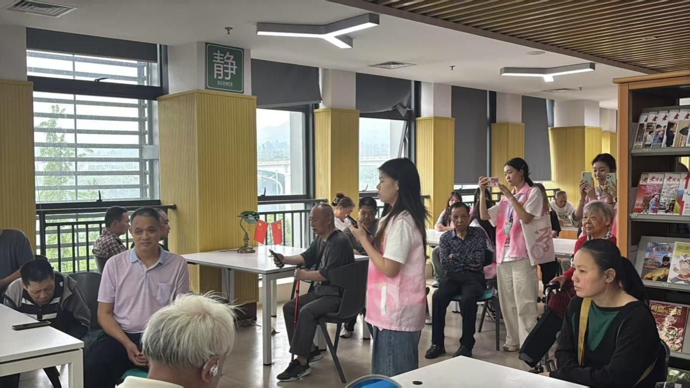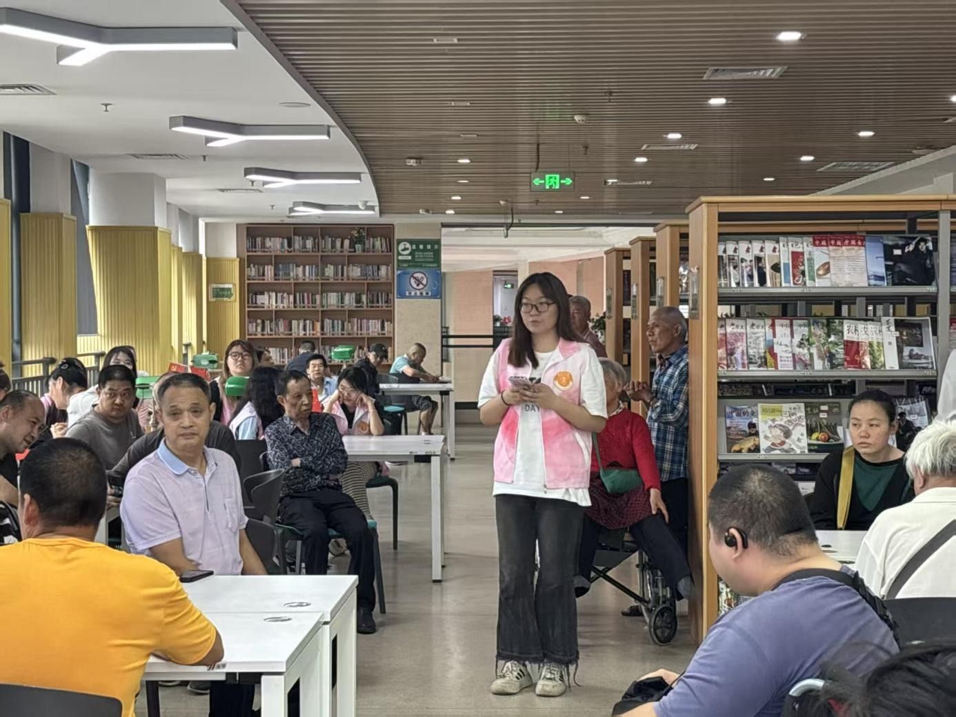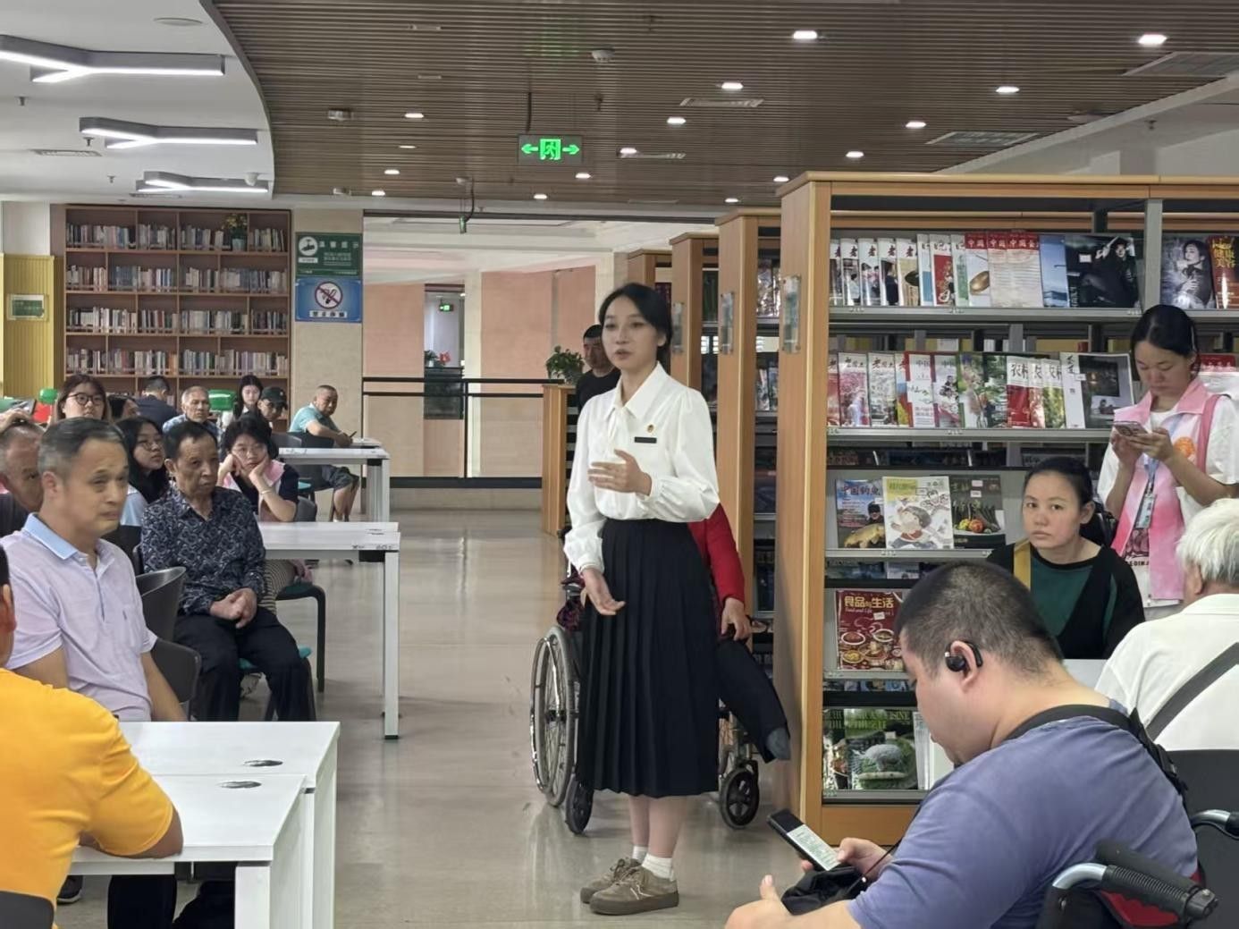 活动伊始,在图书馆工作人员的引导下,大家先详细参观了图书馆的整体布局、文献资源、借阅规则以及丰富的图书资源,让大家对图书馆有了初步的了解。紧接着,大家亲身体验了电子阅读器、有声读物和盲文书籍等多样化的阅读方式。这一环节不仅让众人感受到现代科技在阅读方面的便捷与魅力,也进一步激发他们的阅读兴趣。在读书分享会上,来宾代表以及志愿者分享自己的读书心得,现场的朋友们都在他们的分享中感受读书的乐趣。最后,合川区中医院的针灸科邓仁龙医生教授一套古法养生操。这套养生操不仅有助于提升大家的身体素质,还对他们的身心愉悦具有积极的促进作用。