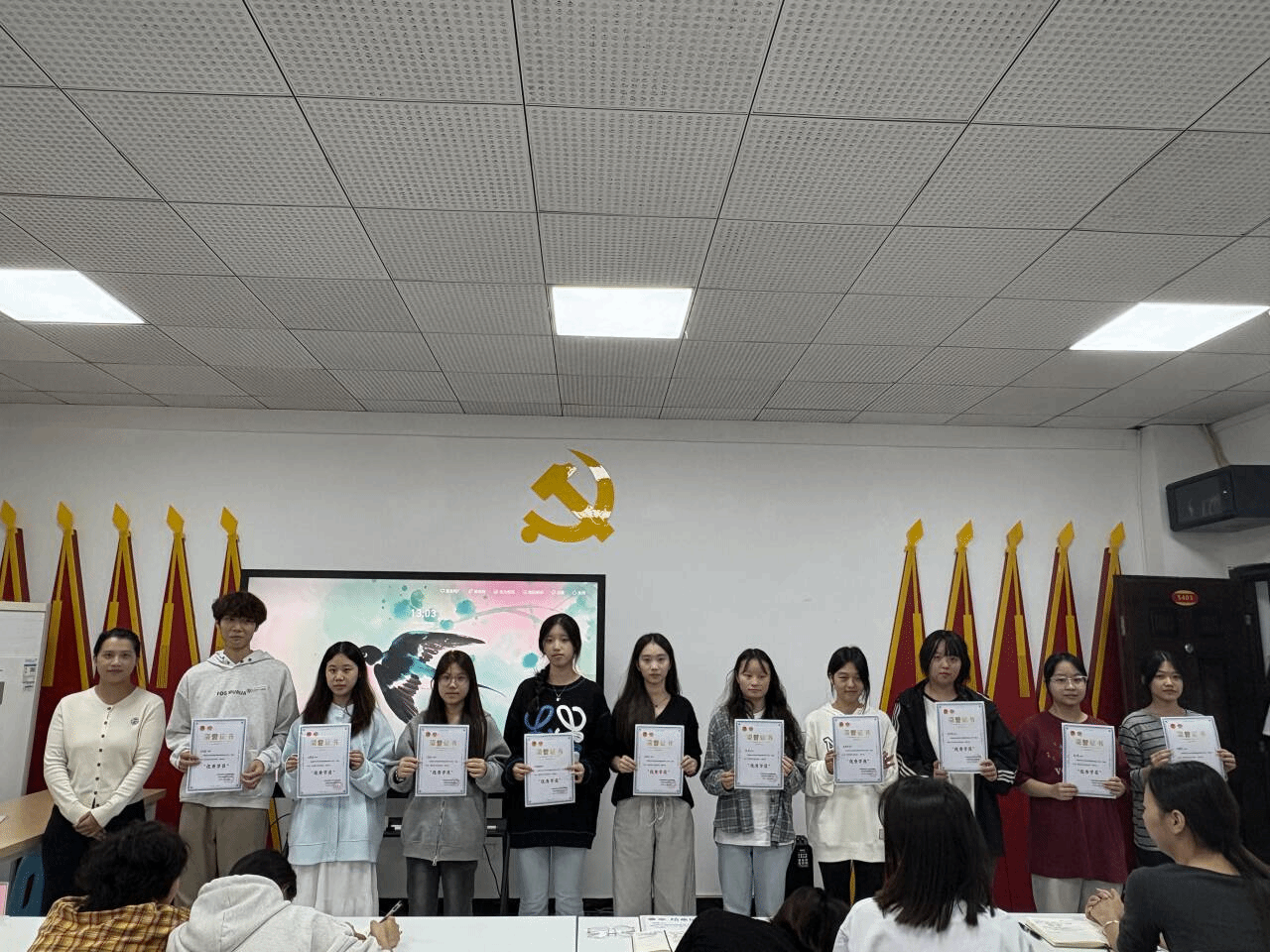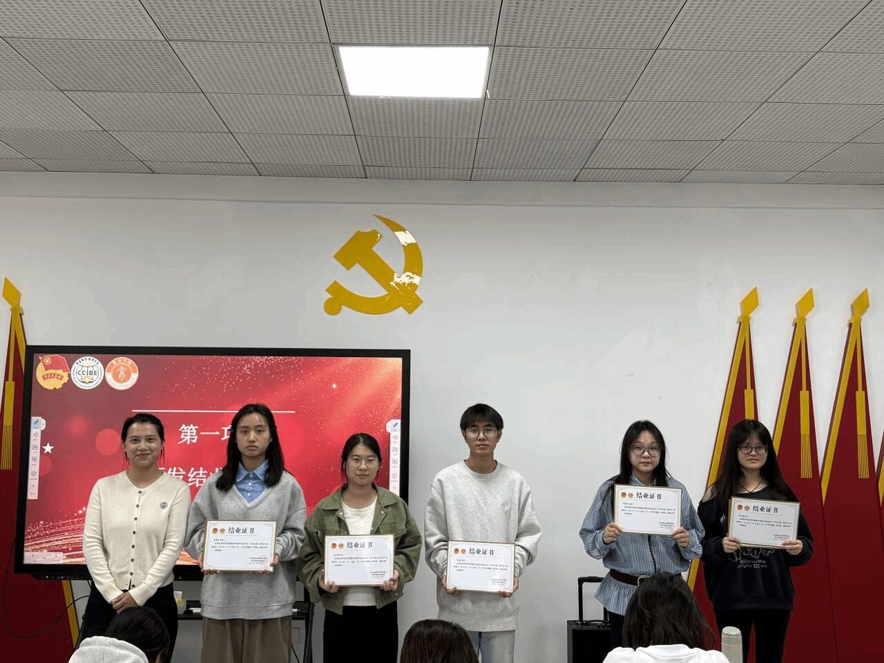 图为团总支书记朱秋盈为各年级代表颁发结业证书