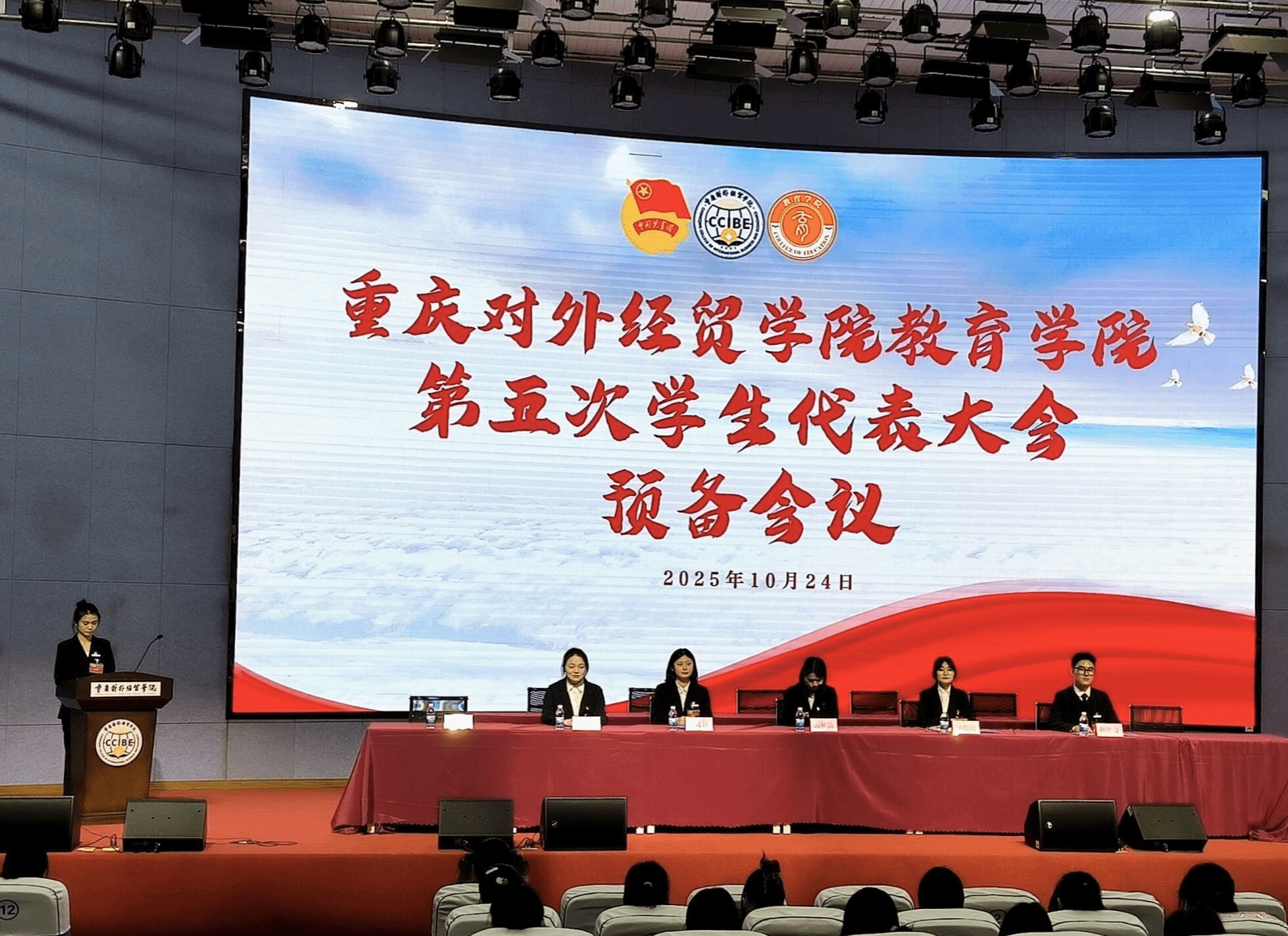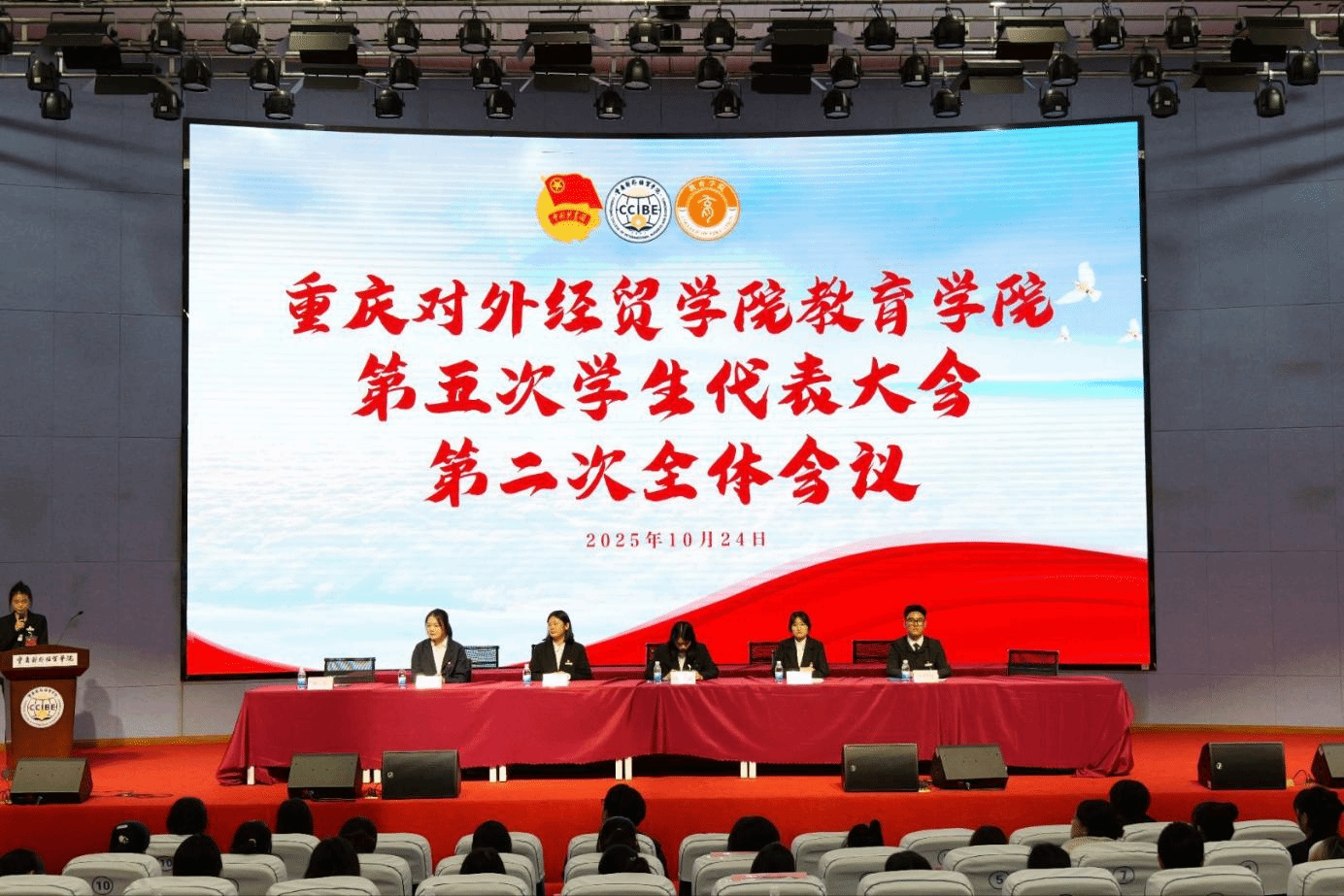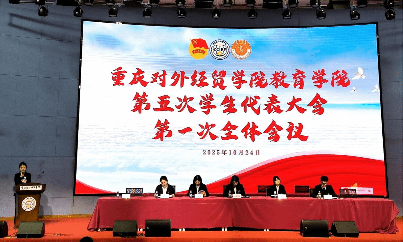 为深入贯彻党的二十大和二十届三中全会精神,落实中国共产主义青年团十九大工作部署,强化青年责任担当。2025年10月24日,重庆对外经贸学院教育学院第五次学生代表大会于合川A校区9101报告厅顺利召开。莅临本次会议的领导有:教育学院院长何万国教授、教育学院副院长许雪梅副教授、教育学院办公室主任周路老师、教育学院团总支书记朱秋盈老师、校团委干事樊林鑫老师、校团委主席团成员周鑫、以及教育学院辅导员郑欣怡老师、陈晨老师、徐依凡老师、董小莹老师、刘小青老师,教育学院教学秘书代欢老师、陈应竹老师,教育学院实验员程玉老师,教育学院上一届学生兼职团总支副书记庞婕妤、曾亮亮,教育学院上一届学生会主席团成员向书环、杜佳汶。本次学生代表大会应到代表63名,实到代表63名。本次大会共分为:大会预备会议、主席团会议、第一次全体会议(开幕式)、分团会议、第二次全体会议(闭幕式)五个阶段进行。