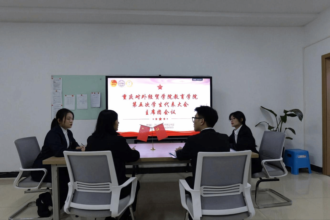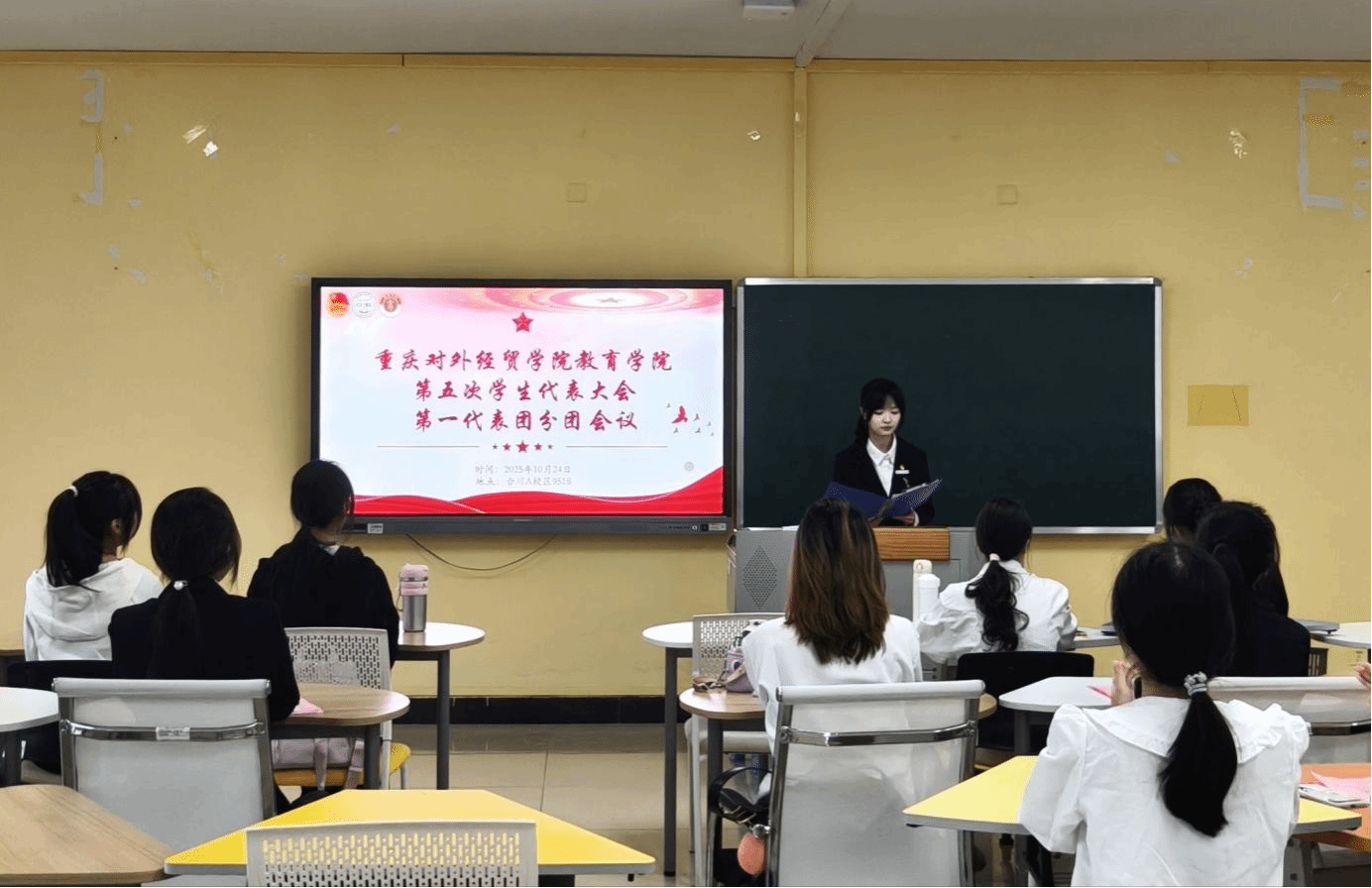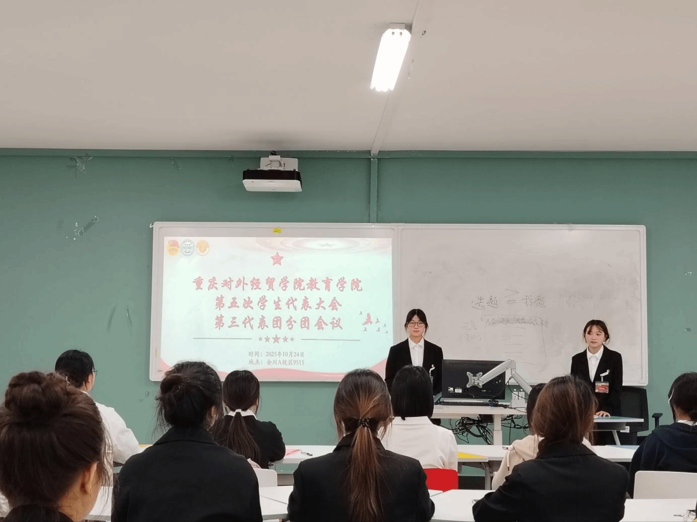 为深入贯彻党的二十大和二十届三中全会精神,落实中国共产主义青年团十九大工作部署,强化青年责任担当。2025年10月24日,重庆对外经贸学院教育学院第五次学生代表大会于合川A校区9101报告厅顺利召开。莅临本次会议的领导有:教育学院院长何万国教授、教育学院副院长许雪梅副教授、教育学院办公室主任周路老师、教育学院团总支书记朱秋盈老师、校团委干事樊林鑫老师、校团委主席团成员周鑫、以及教育学院辅导员郑欣怡老师、陈晨老师、徐依凡老师、董小莹老师、刘小青老师,教育学院教学秘书代欢老师、陈应竹老师,教育学院实验员程玉老师,教育学院上一届学生兼职团总支副书记庞婕妤、曾亮亮,教育学院上一届学生会主席团成员向书环、杜佳汶。本次学生代表大会应到代表63名,实到代表63名。本次大会共分为:大会预备会议、主席团会议、第一次全体会议(开幕式)、分团会议、第二次全体会议(闭幕式)五个阶段进行。