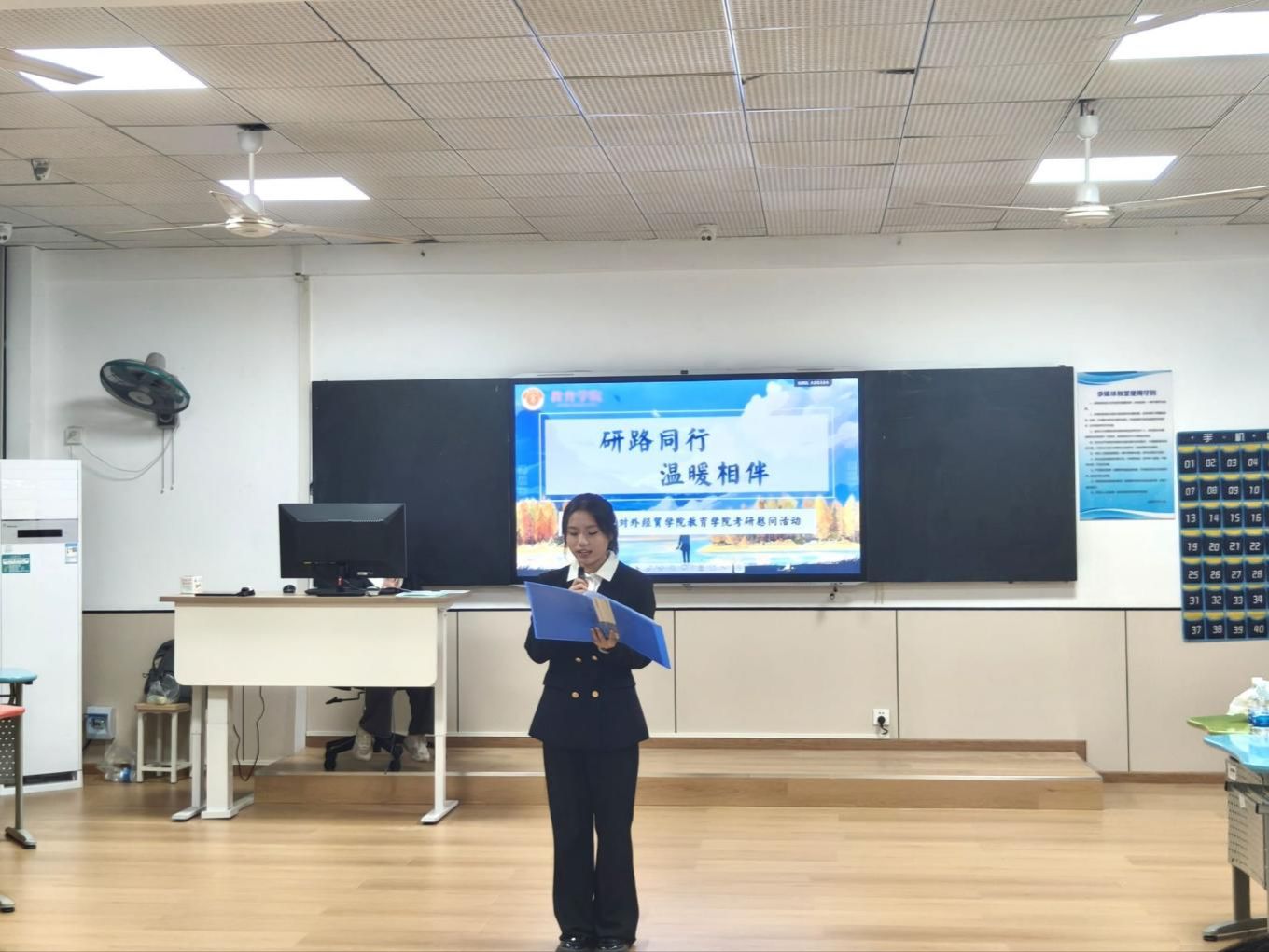 近年来,重庆对外经贸学院教育学院始终坚守立德树人根本任务,深入贯彻落实立德树人育人理念,秉持以生为本的工作导向,密切关注学子成长发展需求,切实把关怀关爱落到实处,以务实举措为学子逐梦之路保驾护航。当前,2026届考研备考已进入冲刺关键阶段,为有效缓解考研学子备考压力,传递学院党委及全体师生的深切关怀与殷切期许,帮助学子们以更饱满的状态、更昂扬的斗志迎战考研,2025年11月27日,教育学院在合川A校区5307教室隆重举办“研路同行,温暖相伴”考研慰问活动。学院领导、全体考研辅导教师、学弟学妹代表与全体考研学子齐聚一堂,以温情互动搭建心灵桥梁,为冲刺路上的逐梦者注入满满暖意与奋进力量。