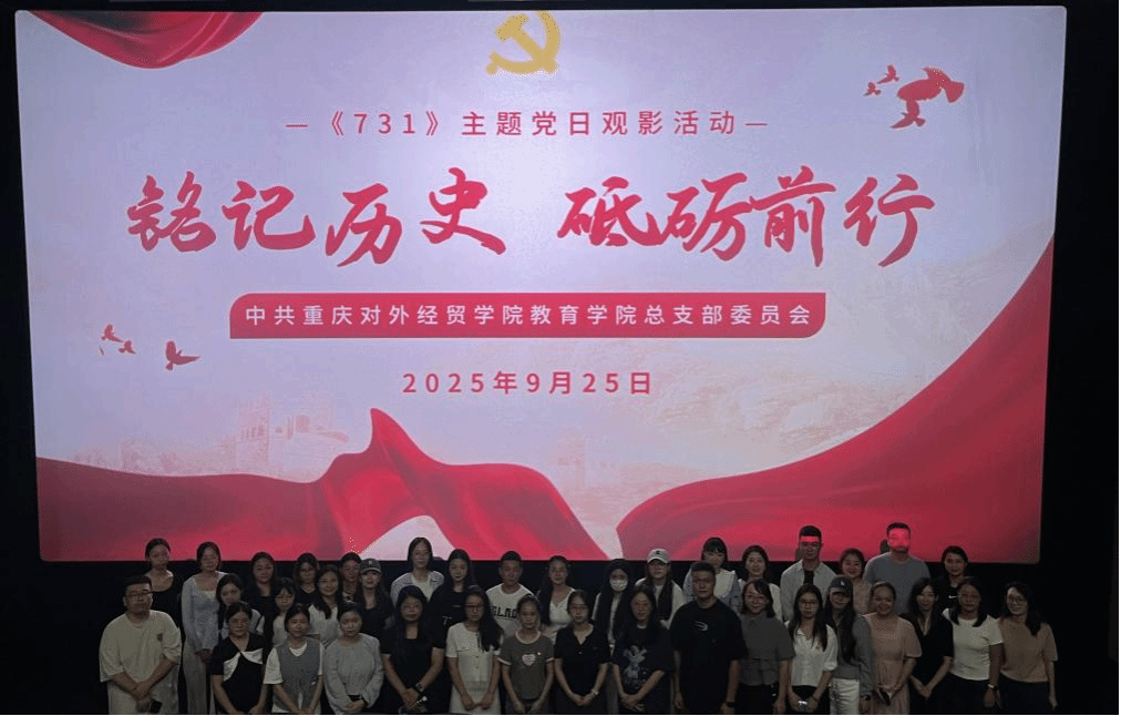 为深入推进党史学习教育常态化长效化,进一步加强党员党性修养,激发爱国热情与奋斗精神,中共重庆对外经贸学院教育学院总支于2025年9月25日组织全体师生党员开展了以"铭记历史砥砺前行"为主题的731主题党日观影活动,集中观看了爱国主义教育影片。