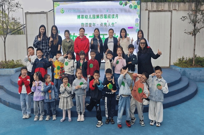 图为何昕原老师、潘朗老师参加花果山博萃幼儿园阅读月活动合影留恋