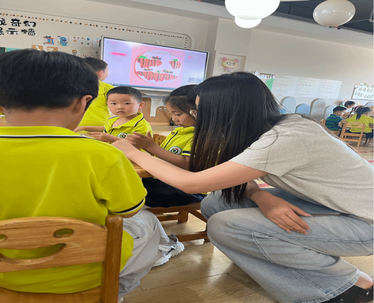 图为何昕原老师在花果山博萃幼儿园,耐心地与幼儿互动交流