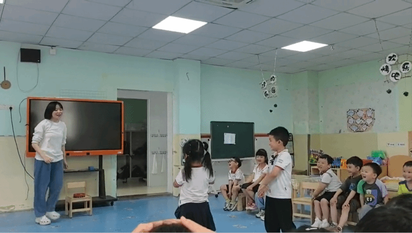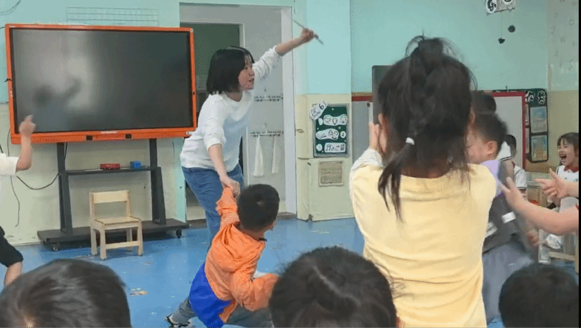 图为温芸西老师在新华小学附属幼儿园带领中班幼儿开展学前戏剧主题活动