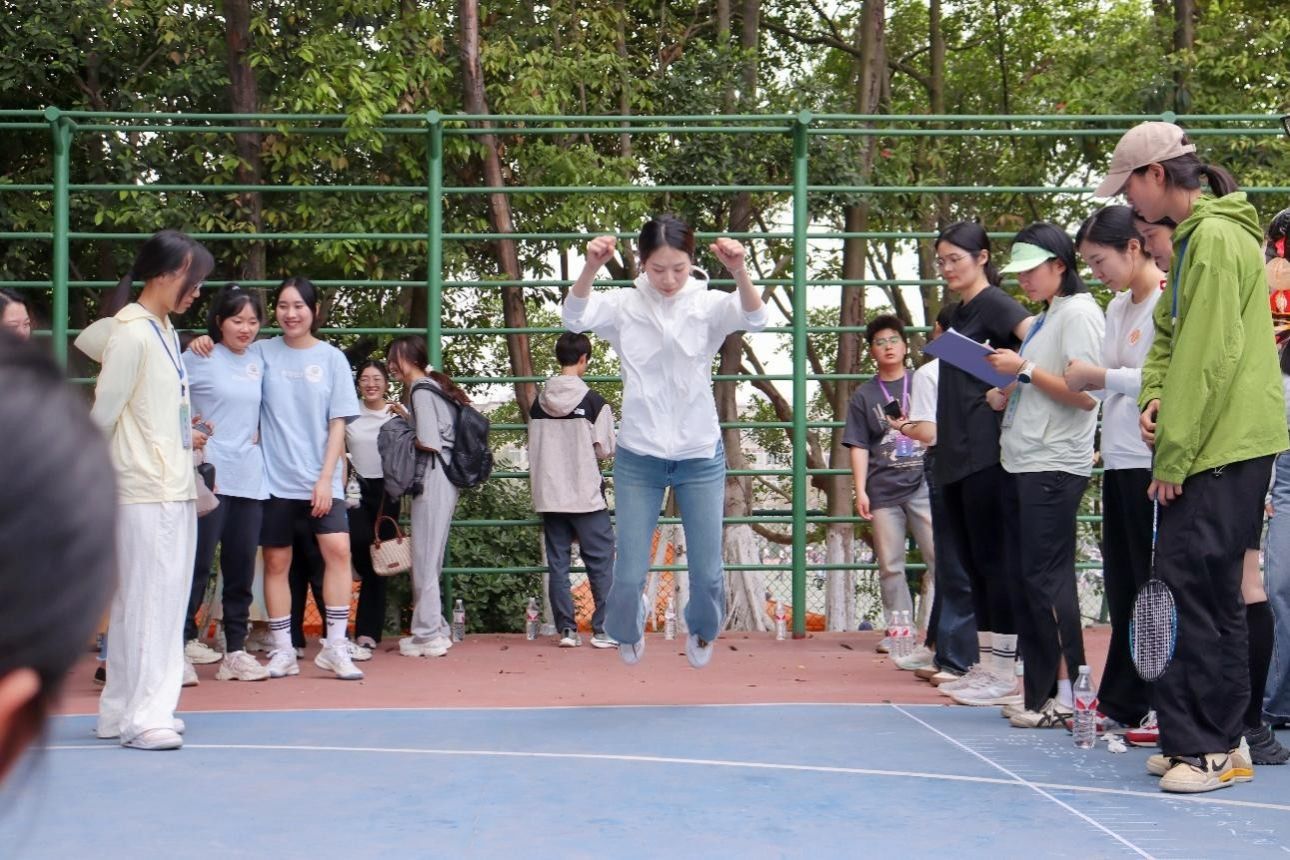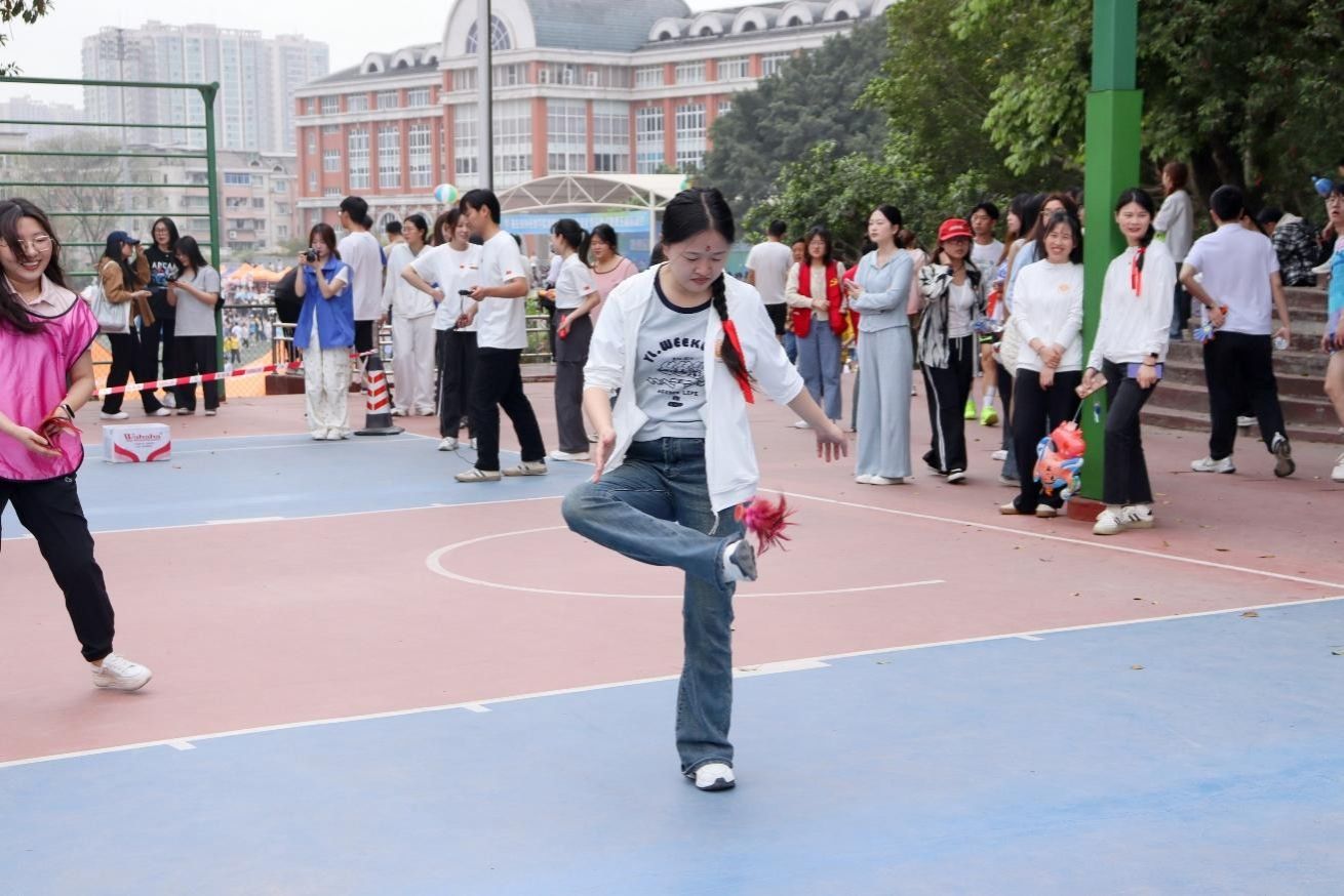 教职工们也积极参与到比赛中,展现出别样风采。趣味项目“同心协力”中,老师们分组合作,步伐一致,向着终点奋力迈进,欢声笑语回荡在赛场;跳绳比赛里,他们身手敏捷,跳绳在脚下飞速旋转,展现出良好的身体素质和运动技巧;踢毽子赛场,老师们轻盈地抬起脚,毽子在他们脚尖上下翻飞,似灵动的精灵;跳远场地,老师们摆好姿势,眼神坚定,起跳瞬间,身姿矫健,在空中划出一道优美的弧线。