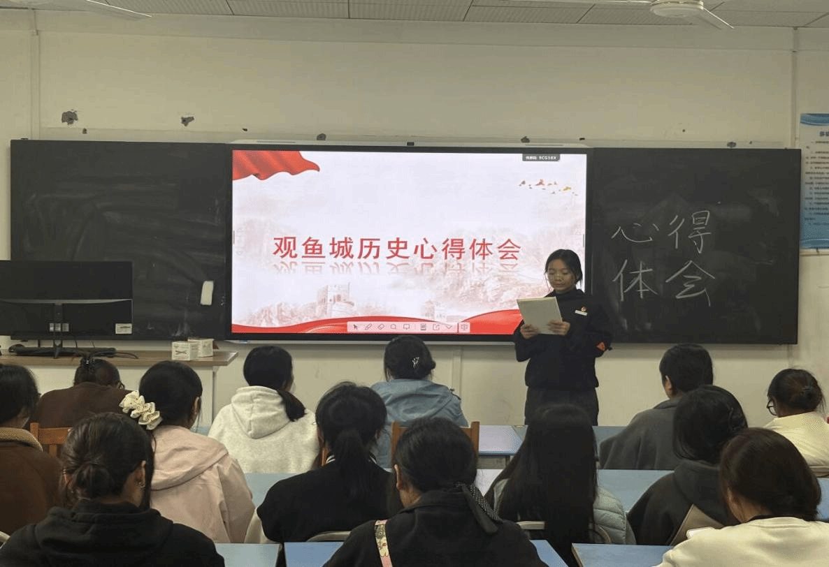 活动伊始,讲解员以“上帝折鞭处”的传奇典故为引,带领同学们穿行于各个展厅。锈迹斑斑的守城兵器、复刻的军事防御图、记载军民抗争的文献史料,以及还原战场场景的多媒体影像,生动再现了钓鱼城军民坚守三十余年、抵御蒙军进攻的壮阔历史。同学们屏气凝神聆听讲解,不时在展品前驻足端详,有的轻声交流对历史细节的见解,有的认真记录民族英雄的事迹,在触手可及的历史遗存中,真切感受鱼城文化的厚重与悲壮。参观途中,互动提问环节让学习氛围愈发浓厚。同学们围绕“钓鱼城的地理优势如何影响战局”“军民同心坚守的精神内核是什么”等问题积极发问,讲解员结合史料逐一解答。之后,全体成员在博物馆“鱼城精神”主题墙前合影留念,定格下这场意义非凡的历史文化之旅。 最后返回教室,随即开展文化讨论,大家结合参观所见所感各抒己见,深入探讨鱼城文化的当代价值。张同学主动分享心得:“钓鱼城军民以弱抗强的坚守,让我读懂了家国大义的重量。作为学前教育专业学生,未来我会把这份精神融入教学,让传统文化在孩童心中扎根。”