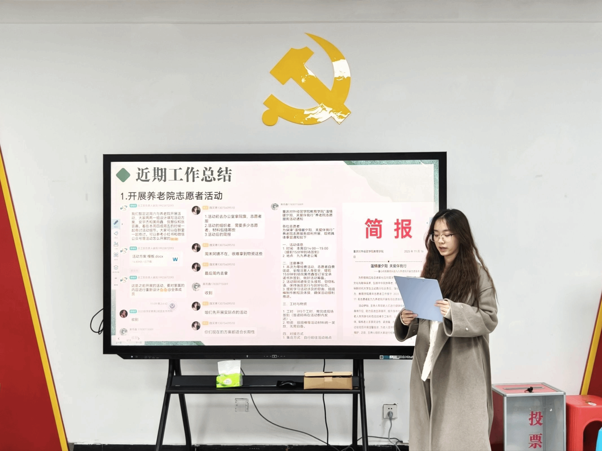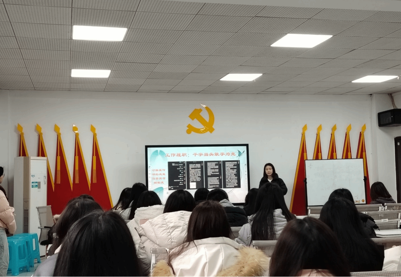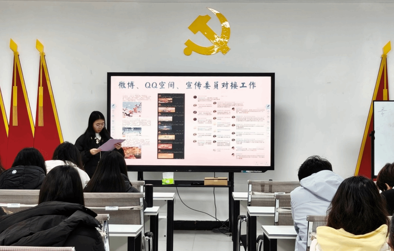 此次例会在全体人员齐唱《中国共产主义青年团团歌》中拉开了序幕。随后各职能部门依次述职,各部门工作汇报均围绕核心职能展开,全面梳理日常事务推进、重点工作落实及未来计划部署,形成“回顾-分析-展望”的完整汇报逻辑。然后各部门工作成果涵盖常规职责履行与特色活动开展。例如权益部的食堂巡检、志工部的志愿服务、宣传部的宣传推广,办公室也完成了会议筹备、推文相关工作、双语解说材料收集、换届大会筹备等多项任务。随后副书记与主席团上台汇报了近期相关工作,指出部门存在问题。同时,各部门直面工作中的问题与不足,并且也制定了相应的计划进行改进,展现出务实求真的态度。最后团学组织工作学生负责人李涛则指出PPT中的不足、请假流程等细节疏漏并推动落实整改。