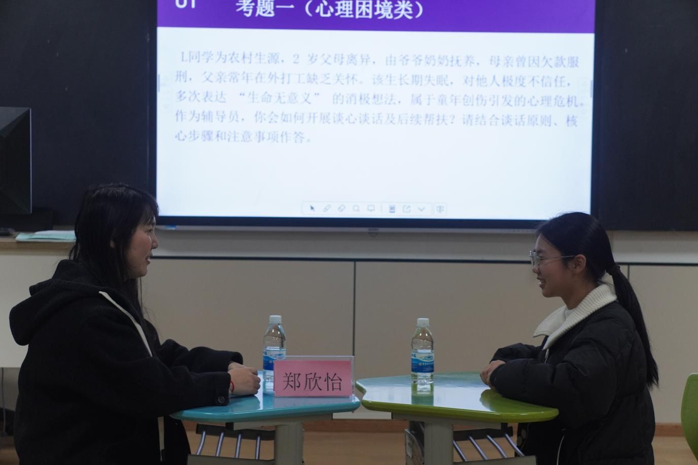 图为郑欣怡老师进行谈心谈话