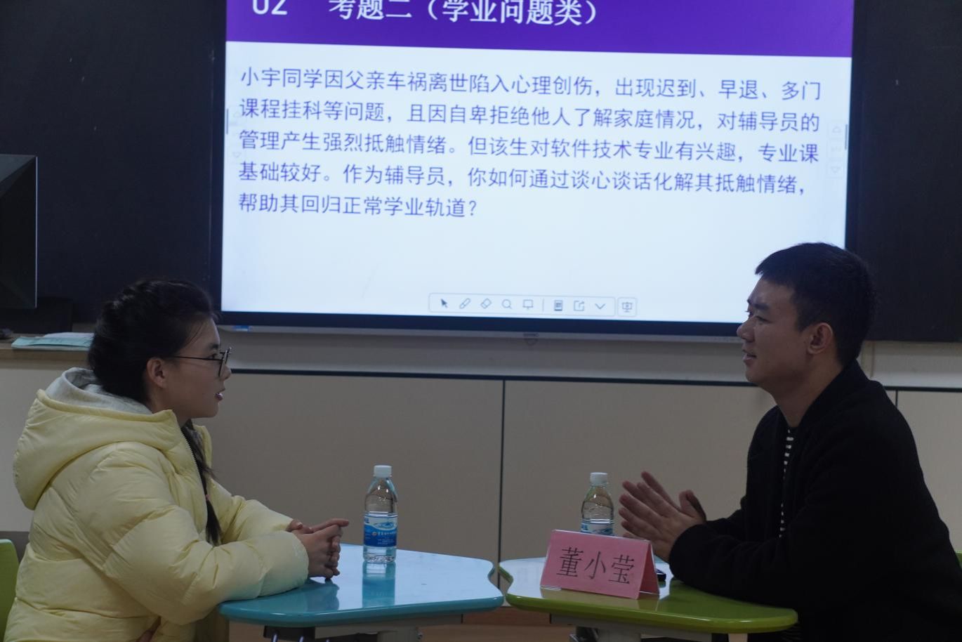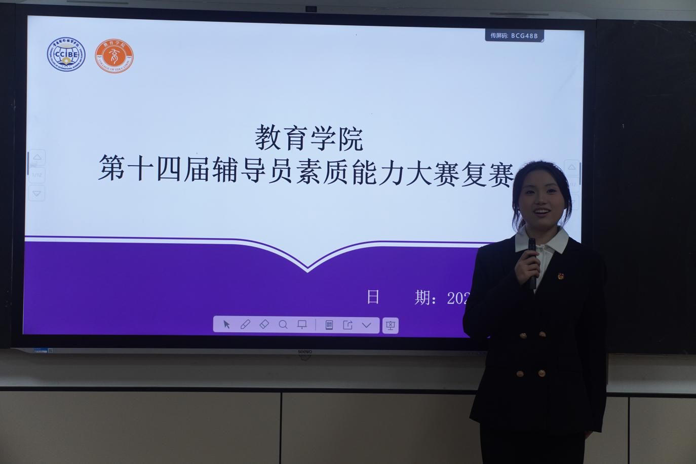 为全面提升学校辅导员的工作能力和综合素质,展示辅导员队伍的育人实效,推动学校思政工作高质量发展,根据《重庆对外经贸学院关于举办第十四届辅导员素质能力大赛的通知》,教育学院于11月27日19:00--20:00在合川A校区5307教室举办“教育学院第十四届辅导员素质能力大赛复赛”,教育学院全体辅导员及开展谈心谈话学生代表及各位评委共同参加比赛。