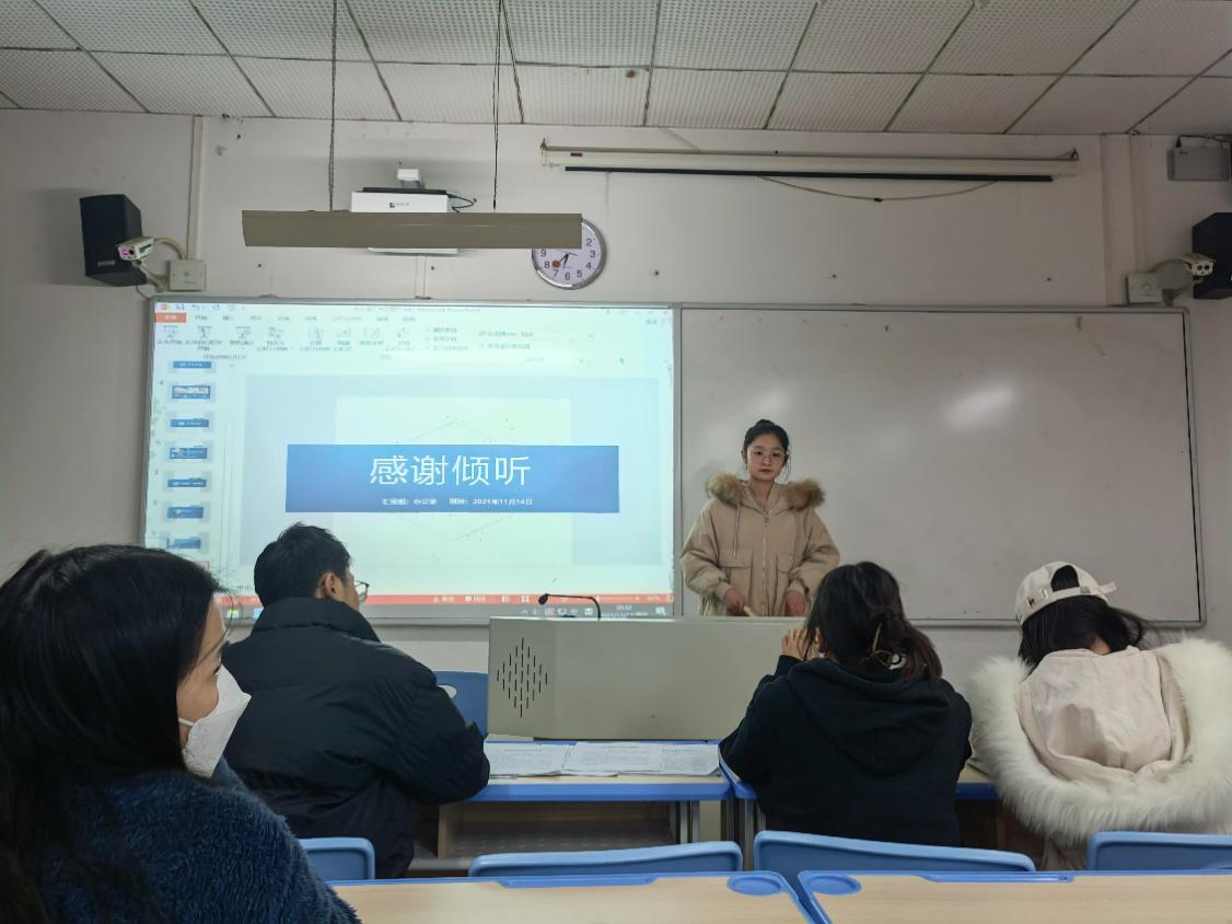 为总结学院学生组织各部门近期工作,提高组织成员工作热情和质量,增强学生凝聚力,更好地践行“全心全意为同学服务”的宗旨,学院于2021年11月14日晚上19:30在合川校区3203组织开展了“初心永存,不负韶华”学生组织期中工作总结暨全国学联文件学习会议,辅导员朱秋盈、合川校区第二届学生组织全体成员参加此次大会。