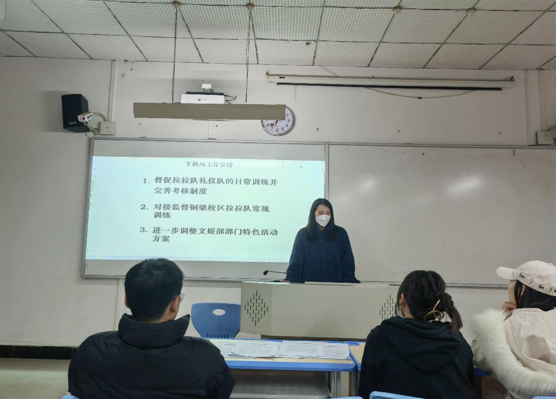 文娱部工作人员曹茜总结到部门的主要工作是配合团总支组织策划并开展各项文体活动,保证各项活动能够顺利开展。现已将礼仪队和啦啦队人员招募完成并将进行规范培训,同时需提高部门成员撰写策划的能力,以提高工作效率。